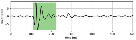 The most informative fragment (the shadowed part in Figure 2) to be compared in order to find the arrival time difference is the moment of the appearance of the greatest amplitude to the vanishing of the signal. The remaining fragments mainly contain noise, which is not relevant for analysis. The same wave recorded using upper and lower geophones may have a different noise appearance; it has been observed that more in-depth measurements have more noticeable noise. Furthermore, it has been observed that the noise present in the signal prior to the arrival of the wave may exhibit a different character than it does at the time of the wave’s appearance. Consequently, the signal decomposition method was deemed unsuitable, and simple smoothing techniques were employed to mitigate the noise.