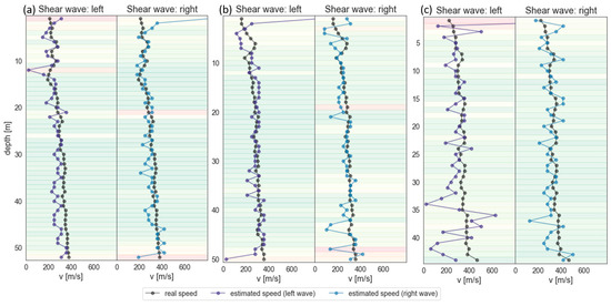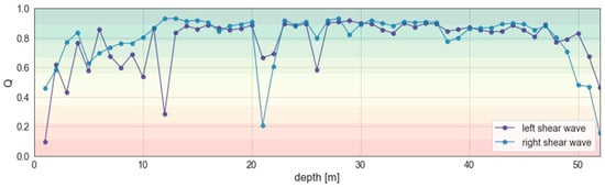 The proposed method of determining the wave speed was tested on real measurements from three SCPT tests carried out on the tailing storage facility dam. Each of the tests was carried out at a depth of about 50 m, and down-hole measurements were performed every 1 m by generating a wave from the left and right sides. This resulted in a total of almost 300 recorded signals (each using two geophones). Cross-hole tests were carried out at the same measurement points, which provide reliable information about the wave speed (later referred to as “real” information). These measurements were used as reference values to assess the accuracy of the estimated results of the DTW-based method. Each of the waves was also assessed in terms of signal quality according to the method of examining the similarity of signals using DTW. Figure 6 shows the results obtained for three tests (Figure 6a–c). The estimated wave speed is presented in relation to the measurement depth and compared with the actual value. In addition, the quality (Q) is marked in color, where red means a signal quality close to 0 and green means a signal quality close to 1. It can be seen that the estimated values are close to the real ones, but they do not fully coincide. There are also some large deviations that usually correlate with a poor signal quality. The worst results were obtained for measurement no. three, which is the left wave.