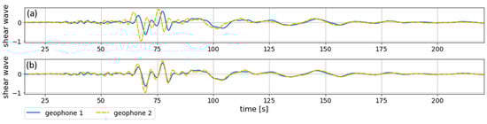 Examples of a selected shear wave recorded using two geophones (a), and after shifting by the determined value Δt, the wave recorded using geophone 2 (b).