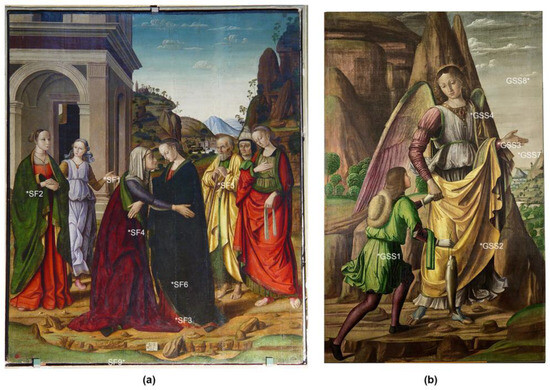 This paper focuses on Santi’s pictorial technique by examining two panel paintings, the Martyrdom of Saint Sebastian (1487–1488) (Figure S1a) and the Visitation (1488–1490) (Figure 1a), and a canvas painting, Tobias and the Archangel Raphael (1490–1494) (Figure 1b), unanimously attributed to Giovanni Santi and dating back between the late 1480s and the early 1490s [2,3,4].