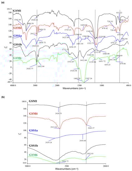 Martyrdom of Saint Sebastian panel and Tobias and the Archangel Raphael canvas: (a) FTIR spectra of the ground layer of samples GSM1, GSM4, GSM6, GSS1a (light brown ground), GSS1b (dark brown ground); (b) Detail of the spectra in the range 3000–2800 cm−1. The dotted lines are meant to show the shift of the signals in the region of interest for different samples.