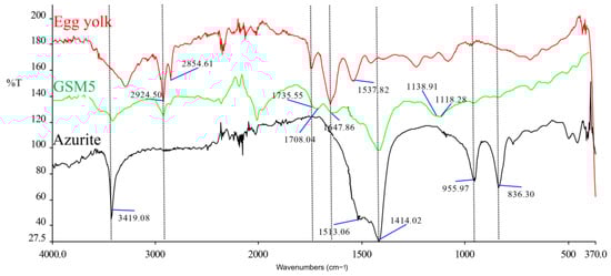 FTIR and FTIR-ATR analysis carried out on the cross-sections of the blue samples (GSM5 and GSM10) confirmed the occurrence of azurite mixed with lead white in different proportions and with small additions of other pigments depending on the hues. In the acquired spectra of the blue grains of sample GSM5, the presence of azurite can be inferred by the characteristic bands at 3419 cm−1 (stretching of the O-H bond), and at 1513 and 1414 cm−1 due to the stretching ν3 of the CO32− ion. In addition, the bands at 956 cm−1 ascribed to the out-of-plane bending of the O-H bond, and at 836 cm−1, due to the stretching ν2 of the CO32− ion, were detected (Figure 3, Table S2) [40]. Bands and peaks indicative of the use of a lipoprotein binder (assigned to egg) were also observed (2924, 2854, 1735, 1648, 1538 cm−1) (Figure 3). The relatively broad peak at 1708 cm−1 was ascribed to carboxylic acids derived from the hydrolysis of eggs’ esters. Lead white, detected on the pictorial layer (a white matrix that includes blue crystals) by FTIR-ATR, was identified by IR spectral features associated with the CO32− rocking deformations (683 and 692cm−1) and the symmetric CO3− stretching vibration at 1044 cm−1. Additionally, the antisymmetric CO3− stretching vibration (1407 cm−1) and the hydroxyl stretching vibration at 3535 cm−1 can be observed [32].
