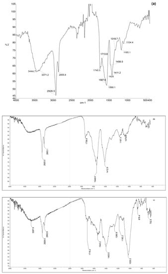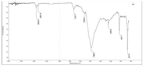 The presence of gypsum (peaks at 1118 and 1139 cm−1) and quartz (peaks at 1080 and 460 cm−1) was also detected [41,42].