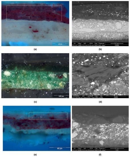PLM and ESEM-EDX observations of the flesh (sample SF1, Table S3) from the Visitation altarpiece detected a priming layer (5 µm) composed of lead white and Fe-based pigments [38]. Lead white, Fe-based pigments and a few orpiment particles were revealed in the off-white priming of the Virgin’s blue mantle (sample SF6: Figure S4a–c, Table S3).