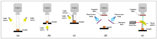 | Diffuse reflectance (Figure 2a) | The detector and the light source are generally positioned above the sample, and the reflected light from the illuminated area is acquired by the detector. This mode is applied to evaluate external quality properties, such as size, shape, color, surface texture, and physical defects. |