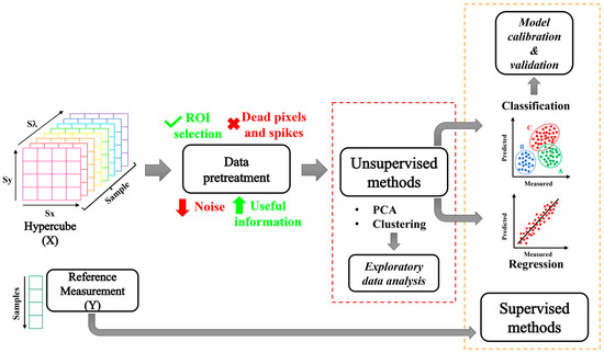 - Amigo, J.M.; Martí, I.; Gowen, A. Hyperspectral imaging and chemometrics: A perfect combination for the analysis of food structure, composition and quality. In Data Handling in Science and Technology; Elsevier: Amsterdam, The Netherlands, 2013; Volume 28, pp. 343–370. [Google Scholar]