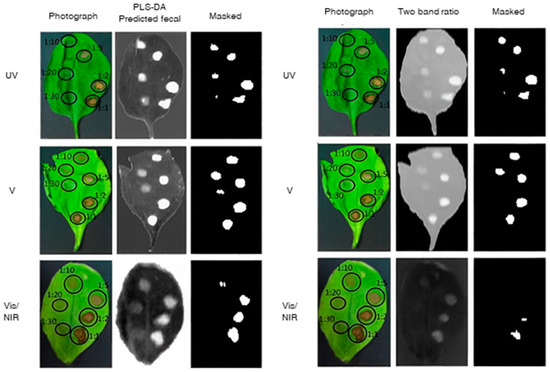 - Mo, C.; Kim, G.; Kim, M.S.; Lim, J.; Lee, S.H.; Lee, H.S.; Cho, B.K. Discrimination methods for biological contaminants in fresh-cut lettuce based on VNIR and NIR hyperspectral imaging. Infrared Phys. Technol. 2017, 85, 1–12. [Google Scholar] [CrossRef]