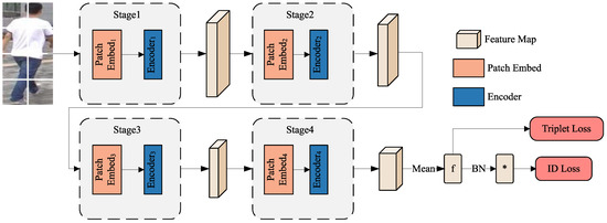 PVT-based basic framework. The whole model can be divided into two parts, namely, feature extraction and feature utilization. The feature extraction stage can be divided into four stages; each stage has a PatchEmbed and an Encoder composed of multiple Transformer layers. According to the pyramidal structure, the resolution of the output feature maps of the four stages decreases from the front (1/4 the original image size) to the back (1/32 the original image size). The final output feature maps are subjected to representation learning and metric learning, respectively. Inspired by [], we introduce the BNNeck before the ID Loss. * is applied to the feature using Batch Normalization.