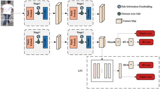As shown in Figure 1, ourproposed ReID framework for obtaining robust person features is designed on the basis of a PVT-based image classification network along with several useful improvements []. To further enhance the robustness of person feature training in the face of the many challenges involved, in Section 3.2 and Section 3.3 we present the comprehensive design of a local feature clustering module (LFC) and side information embeddings (SIE) module. The resulting end-to-end network uses both modules at the same time, as displayed in Figure 2.