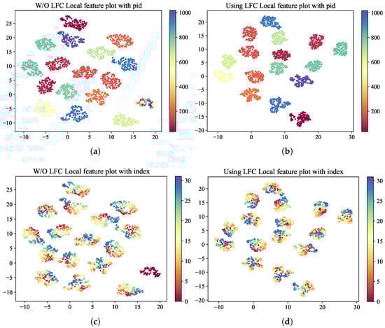 Figure 3a,c shows that most of the local features in the feature space are aggregated around the corresponding ID clusters, while a small portion are in a discrete state. After the introduction of the LFC module in the base network, Figure 3b,d shows the discrete local features clustered around the corresponding IDs, which indicates that the LFC module can alleviate the problem of discrete local features and improve the robustness of the resulting features.