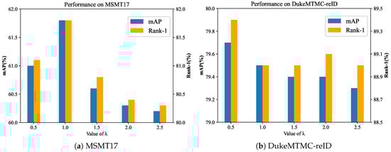In Figure 4, when = 0, Basic achieves 60.2% mAP on MSMT17 and 77.8% mAP on DukeMTMC-reID. With increasing , Basic achieves 79.7% mAP on DukeMTMC-reID when = 0.5 and 61.8% mAP on MSMT17 when = 1.0. This performance indicates that SIE helps to reduce the impact of environmental factors on the robustness of person features and can help the model to learn invariant features. Continuing to increase the value of results in the model’s performance decreasing. This is due SIE dominating person features and the role of vision information being weakened when is too large.