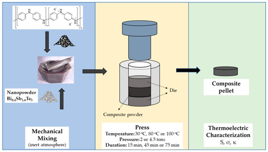 The composite PANI-Bi0.4Sb1.6Te3 powders were prepared via mechanical mixing of the polymer powder with the inorganic additive. More precisely, composite PANI-Bi0.4Sb1.6Te3 powders with 20 wt.% and 30 wt.% Bi0.4Sb1.6Te3 content were initially prepared. The two blending ratios were selected based on a previously reported comparable system appearing in the literature, consisting of PANI and Bi2Te3 in a 70–30% wt. ratio [31]. Mechanical mixing was carried out for 15 min in a glovebox under an inert (argon) environment using a mortar.