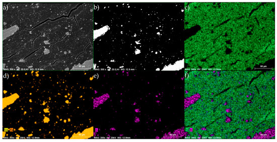 Furthermore, Figure 5a–e with EDS mapping (20 kV, standardless ZAF-matrix corrected method) provides information on the distribution of the BST additive (as seen from the secondary electron detector (SE) and back-scattered electron detector (BSE) images), whereas in Figure 5f, the elemental contrast between the polymer matrix and the additive can be clearly observed. Additionally, the formation of cracks in the samples is apparent, and it could be attributed to either the cooling process applied after pellet formation or to the sample preparation prior to the measurements. Apparently, the presence of both BST agglomerates and cracks within the composites may affect their thermoelectric properties.