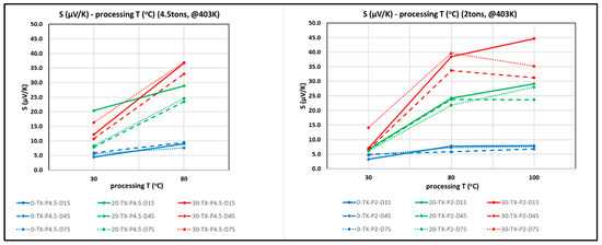 Graphs of Seebeck coefficient (S) versus processing temperature (T) measured at 130 °C (403 K) at 4.5 tons (left) and 2 tons (right). The effect of the additive content (pure PANI—blue, 20 wt.% BST—green and 30 wt.% BST—red) and processing times (15, 45 and 75 min) can be seen in the graphs. In legend, X denotes the processing temperature, which is either 30, 80 or 100 °C.