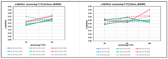 Graphs of thermal conductivity (κ) versus processing temperature (T) measured at 130 °C (403K) at 4.5 tons (left) and 2 tons (right). The effect of the additive content (pure PANI—blue, 20 wt.% BST—green and 30 wt.% BST—red) and processing times (15, 45 and 75 min) can be seen in the graphs. In legend, X denotes the processing temperature, which is either 30, 80 or 100 °C.