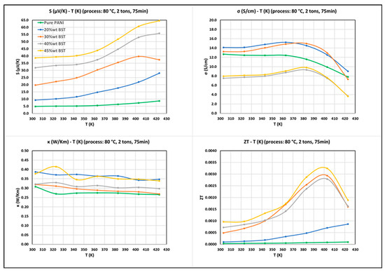 Graphs of Seebeck coefficient (S), thermal conductivity (κ), electrical conductivity (σ) and figure of merit (ZT) versus measuring temperature (T), within the range of 30–150 °C (303–423 K), for specimens prepared using the following processing parameters: processing temperature: 80 °C; processing pressure: 2 tons; processing time: 75 min. The BST content varies from 0 wt.% (green), to 20 wt.% (blue), 30 wt.% (orange), 40 wt.% (grey) and 45 wt.% (yellow).