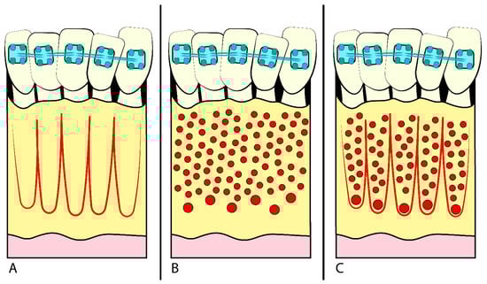 Figure 1. (A) Corticotomies; (B) MOPs; (C) combination of both techniques. - MOPs are small perforations in the alveolar bone around the teeth, obtained using miniscrews or fine needles [8]. The drilling process stimulates the local inflammatory response and accelerates bone remodelling, allowing for faster and more efficient OTM (Figure 1B) [5]. MOPs can be performed safely and with minor patient morbidity, reducing orthodontic TT [8,10].