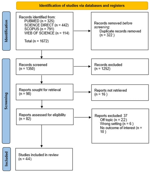 The electronic database search generated 1672 results. Following duplication elimination, 1350 studies were screened for titles and abstracts. After the abstract screening, 1252 papers were rejected, and 82 articles were chosen for the eligibility evaluation. Following the full-text examination, 37 manuscripts were eliminated: 21 were off-topic, six had wrong settings, and 10 had no outcome of interest. Finally, 44 papers were chosen for the systematic review, divided for each acceleration technique into:
