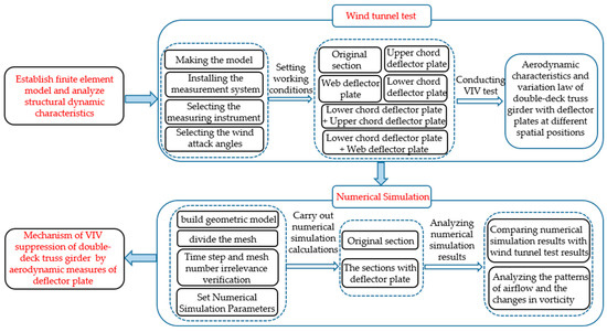 In this paper, the suppression effect on VIV of a double-deck truss girder by the spatial position of the deflector plate is studied through wind tunnel tests and numerical simulations. The methodology diagram of this paper is shown in Figure 1.