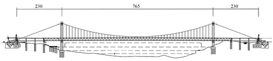 The main girder of the Huangjuetuo Yangtze River Bridge is a double-deck truss girder with a height of 15.76 m and a width of 31.30 m. There are six lanes on the upper deck and four lanes and two tracks on the lower deck. The target bridge is a three-span double-deck truss girder suspension bridge, and the specific arrangement of the structures are shown in Figure 2 and Figure 3.
