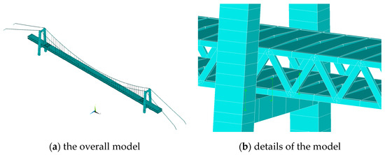 The main cables and suspenders of the bridge were simulated with Link8 units, while the remaining main parts, such as the bridge deck, main tower, and webs, were simulated with Beam4 units; other affiliated members, such as guardrails and maintenance vehicle tracks, were simulated with Mass21 units [33]. Each node was assigned three degrees of freedom, the number of nodes was 7834, and the number of elements was 23,414. The material parameters of each bridge member are shown in Table 1.