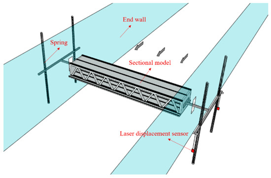 This paper selected a section model with a scale ratio of 1:55 for wind tunnel tests [36]. The spring suspension system used in the vibration test is shown in Figure 6. The suspension system composed of eight springs provides the vertical and torsional stiffness of the system at the same time. Adjusting the spring stiffness allows the vibration characteristics of the two degrees of freedom of vertical bending and torsion to be accurately simulated. A laser displacement sensor was arranged on the boom, and the vibration response time history of the model was collected after the wind speed of the incoming flow and the vibration of the model were stable.