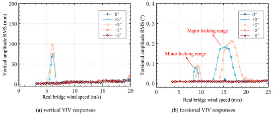 It can be seen from Figure 8 that no matter whether it was the locking range of vertical VIV or the major locking range of torsional VIV, the maximum amplitude of VIV at a +5° attack angle was significantly greater than that at a +3° attack angle. However, for the minor locking range of torsional VIV, its maximum amplitude was not significantly affected by the attack angle. When vertical VIV occurred on the bridge, the onset wind speed at a +5° attack angle was earlier, and the locking range was longer than that at a +3° attack angle. Generating a more obvious vertical VIV in the low wind speed range was easier. When torsional VIV occurred on the bridge, the onset wind speed at a +5° attack angle was obviously delayed compared with a +3° attack angle, the length of the major locking range was significantly increased, and the maximum amplitude of the VIV was also significantly increased. No obvious VIV was observed at 0°, −3°, and −5° attack angles. At a +3° attack angle, the locking range of vertical VIV was 5.24 m/s~6.72 m/s, and the locking ranges of torsional VIV were 8.13 m/s~9.52 m/s and 12.27 m/s~18.06 m/s. At a +5° attack angle, the locking range of vertical VIV was 5.01 m/s~6.69 m/s, and the locking ranges of torsional VIV were 8.53 m/s~10.01 m/s and 13.75 m/s~19.49 m/s.