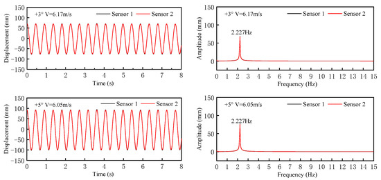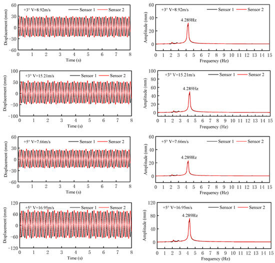 It can be seen from Figure 9 that the phases of the time history curves measured by the two sensors were the same, and the primary frequency of vertical VIV was 2.227 Hz, which was close to the vertical VIV frequency of the test model. It can be seen from Figure 10 that the phases of the time history curves measured by the two sensors were opposite, and the primary frequency of torsional VIV was 4.289 Hz, which was close to the torsional VIV frequency of the test model.