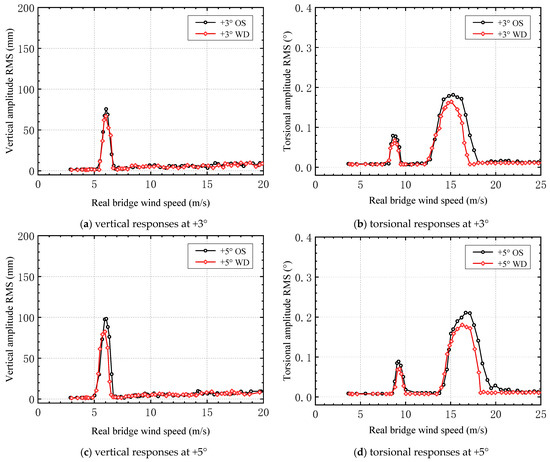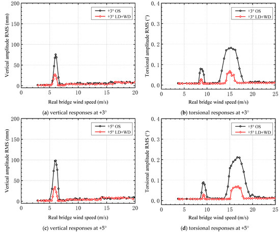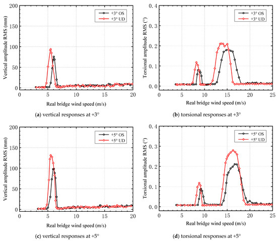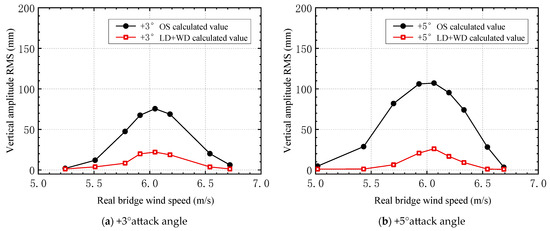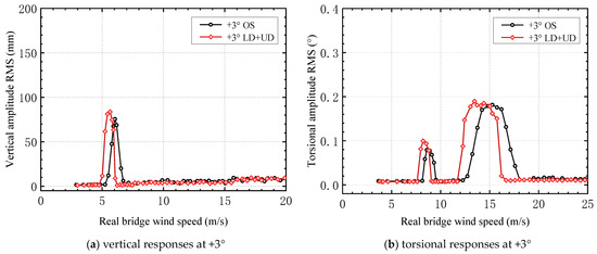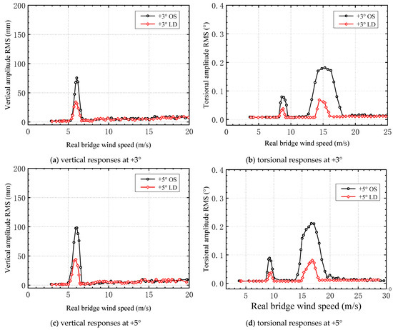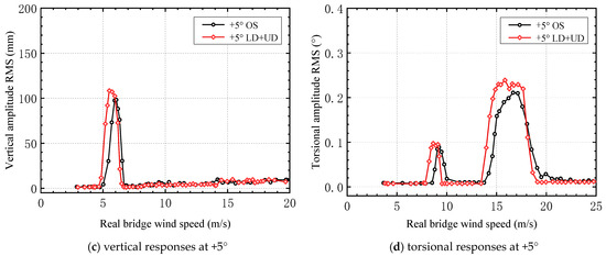 After the lower chord and upper chord deflector plates were added, the relationship between the vertical and torsional VIV amplitudes and the wind speed under attack angles of +3° and +5° was determined (Figure 16).