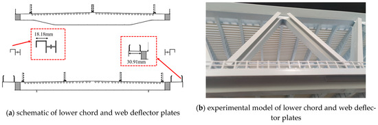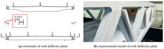 The web deflector plate was added to the original cross section and arranged symmetrically on both outsides of the webs along the truss girder and was in the form of a right-angled deflector plate. The position and shape of the web deflector plate are shown in Figure 17.