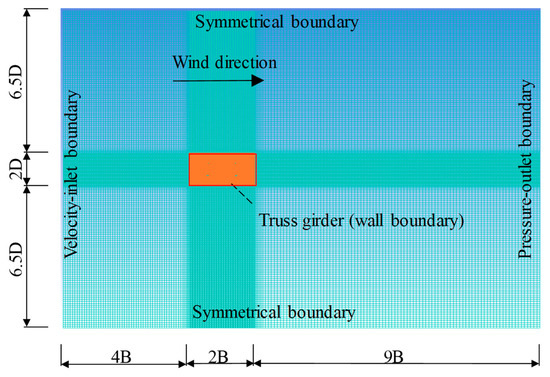 In order to study the vibration suppression mechanism of deflector plates, the external flow field of the truss girder was simulated based on the Fluent platform [40]. The numerical simulation software was ANSYS Fluent 15.0, the calculation adopted transient calculation, the calculation turbulence model selected the SST k-ω model that has good adaptability to the flow around the blunt body section, the solution calculation method was Coupled, the discrete spatial format adopted the second-order upwind method, and the time step was set to 0.0001 s to meet the Courant number requirements [41].