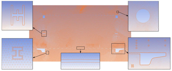 Both the computational efficiency and the accuracy of the numerical analysis results were affected by the meshing quality, so the meshing needed to be appropriate. In order to calculate the displacement of the model in the x and y directions by using a dynamic mesh, an overlapping grid was used for all numerical analyses in this study. Figure 22 shows the mesh of the computational domain of the original section of the truss girder.