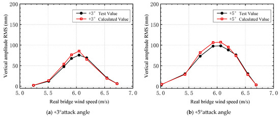 After the web deflector plate was added, the relationship between the vertical and torsional VIV amplitudes and the wind speed under attack angles of +3° and +5° was determined (Figure 18).