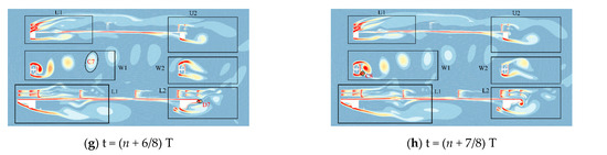 It can be seen from Figure 24 that vortices were generated and shed at multiple positions on the section at the same time; the size and form of the vortices were different, and the speed and period of shedding were also different. The vortex shedding period at the windward side of the web bar with the most extended shedding period was selected as the display period. The incoming flow was separated after being hindered by the upper chord, railing, web, and lower chord on the windward side, and the airflow formed a larger vortex area in the U1 area. The A1 vortex in the U2 area began to appear, and after continuous development and changes, the A5 vortex was finally formed. At time nT + 5/8T, the A5 vortex in the U2 area altogether shed and disappeared, and the A6 vortex began to appear at the upper chord position on the leeward side, which indicated that the vortex shedding on the upper chord on the leeward side experienced a periodic change.