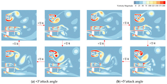It can be seen from Figure 26 that at +3° and +5° wind attack angles, due to the effect of the sheer skirt of the lower chord deflector, the length of the separation zone at the lower chord deflector was significantly smaller than that of the original section. The velocity of the flow around the lower surface was reduced so that the vorticity at the exact position of the lower chord deflector was significantly lower than that of the original section, so the lower chord deflector plate can effectively suppress the VIV response. At the position of the web deflector, although the degree of flow separation was weakened compared with that of the original section, a weak Karman vortex street was still formed, which can slightly suppress the VIV response.