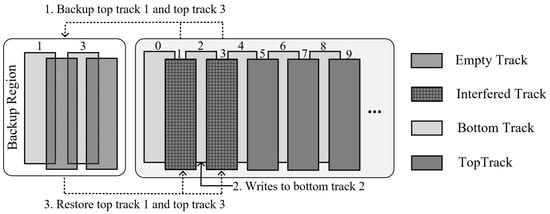 Recently, various types of SMR disks have gradually been emerging in data centers and cloud storage providers to meet the demand for low-cost, high-volume storage [,]. However, the random writes of SMR disks suffer from significant write penalties, leading to their limited application scenarios and preventing them from fundamentally replacing CMR disks []. As an alternative to CMR disks, IMR disks are starting to gain attention with their higher capacity and lower write penalty. To achieve a more favorable tradeoff between in-place updates and areal density, the tracks of an IMR disk are logically divided into an equal number of top and bottom tracks, and each bottom track overlaps only two adjacent top tracks. With the benefit of energy-assisted technology, IMR-disk-based track layouts can achieve much higher areal densities than CMR disks and slightly higher areal densities than SMR disks. According to existing research, the bottom track provides more than 10% [] or 27% [,,] higher linear density than the top track. In practice, the capacity gap between the top and bottom tracks is attributed to the difference in laser power required to write data to them. The consequence of this is that the top track can be written freely, while writes to the bottom track destroy valid data in the adjacent top track. Therefore, IMR disks introduce an RMW operation similar to that of SMR disks to ensure crash consistency. As shown in Figure 2, when the write request for bottom track 2 arrives, the disk first copies the valid data from top tracks 1 and 3 to the backup region of the disk, then writes the incoming data to bottom track 2, and finally migrates the backup data to the native location, which requires a total of three writes and two reads. Despite the extra I/Os introduced by the bottom track writes, the interlaced track layout allows the IMR to suffer from a much lower rewrite overhead than the SMR. Note that the non-overlapping region with the top track is sufficient to read valid data in the bottom track, leaving the read operation on the bottom track unrestricted. In addition, real-time data overwrite techniques and lazy data overwrite techniques [] are used to overwrite data within the backup region to prevent the disk from restoring outdated backup data to its native location when the system is rebooted.
