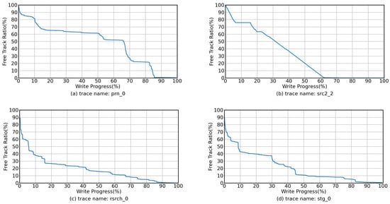 In real-world workloads, new write requests and update write requests alternate on disk, meaning that free tracks are not immediately exhausted. To better illustrate this phenomenon, we analyzed the block-level traces obtained from Microsoft Research (MSR) Cambridge [,] and selected four traces, namely prn_0, src2_2, rsrch_0, and stg_0. These traces are write-intensive workloads, with the key difference being that the first two are dominated by spatial locality, while the latter two are dominated by temporal locality. In addition, since all existing IMR studies use a track-level data placement method (each logical track is mapped to a unique physical track, and incoming data are placed at the appropriate location on the physical track according to its offset within the logical track), we used the typical three-phase write management method as the baseline policy for data placement. Detailed information about the workload and experimental platform characterization can be found in Section 5.1. As shown in Figure 3, the temporal-locality-dominated workloads, rsrch_0 and stg_0, trigger top-track allocation when write progress reaches 6% and 9%, respectively. In contrast, the spatial-locality-dominated workloads prn_0 and src2_2 have slower track consumption rates, with top track allocation triggered only when write progress is 66% and 32%, respectively. Although rsrch_0 and stg_0 initiate top-track allocation early in the workload, the rate of free track allocation gradually slows as write progress increases. In summary, regardless of the rate of free track consumption at each stage of the workload, there are always free tracks available on the disk until the write progress reaches 100%.