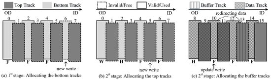 The goal of the adaptive write interference data placement module is to improve placement efficiency by dynamically placing data on the specified track based on seek distance or track hotness. To prevent the unnecessary introduction of track rewrites, the allocation of tracks in the bottom region takes precedence. Initially, all unallocated tracks reside in the free track pool. As long as there are free tracks in the bottom region, any new incoming data are placed on these tracks. To minimize seek latency, the track allocator searches for the nearest free bottom track in the inside diameter (ID)/outside diameter (OD) direction, starting with the track accessed by the last I/O request. As shown in Figure 5a, there are no valid data that exist above the bottom track at this stage; so, it can be written freely without incurring additional rewrite overhead.