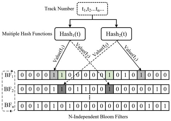 Figure 6 shows the proposed track-level multiple Bloom filter (TMBF), which consists of M hash functions and N-independent Bloom filters (BFs), where each BF contains P bits to store M hash values. When an update request arrives, the target track number is entered into the TMBF, and then the hash value generated by each hash function is inserted into the corresponding bit in the specified BF. If the bit of the current BF is “positive” (i.e., the corresponding bit of the track in the BF is 1), the TMBF selects the next BF in a round-robin fashion. As shown in Figure 6, for track 2, the corresponding bit in is positive (indicated by the green rectangle) and is not yet set, so is selected to set the bits. In practice, the number of consecutive positive results in the TMBF indicates the frequency of track updates. Since the number of BFs is limited, a freezing method [,] is used to prevent bit overflow if the corresponding bits in all BFs are positive. In addition, the TMBF periodically zeroes all bits of the oldest BF in a polled fashion to capture the recency of track hotness. To further improve the classification accuracy, the hotness of tracks is classified as frozen, warm, and hot. Specifically, in the TMBF, a frozen track has no “positive” results; a warm track has several consecutive “positive” results between (0, N); and a hot track has at least N positive results. The reason for this is that our scheme approximates the hotness of tracks by checking whether the track has been updated rather than the exact number of updates. Therefore, for a frozen track that has never been updated, we can assume that it is unlikely to be updated.