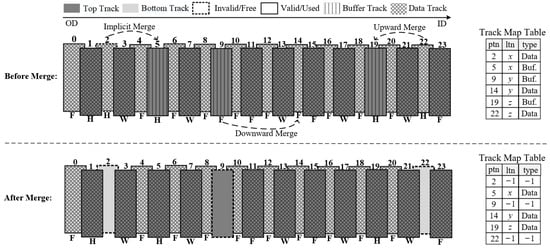 Illustration of the track merge operation, where x, y, and z represent the logical track numbers and F, W, and H denote track hotness, i.e., frozen, warm, and hot, respectively.