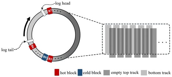 Data shuffling aims to achieve the desirable hot and cold data layout by migrating hot data to the top tracks where it can be freely written. To reduce the mapping overhead of redirected data, Hajkazemi et al. [] proposed three techniques for data shuffling at the track level, namely selective track caching, track flipping, and dynamic track mapping. The core idea of these techniques is to reduce the introduction of track rewrites overhead by migrating the hot bottom track to the freely written top tracks or reserved region within the disk. However, these techniques either make poor use of the space available for freely written tracks or ignore the hotness of the adjacent bottom track, which limits their performance gain for IMR. In addition, to minimize the introduction of extra I/Os, MOM [] suggests moving top tracks affected by write interference to other free top tracks with low rewrite probability instead of the typical RMW operation. However, this method retriggers the RMW operation when the disk is full because there are not enough free tracks to accommodate the moving data. As a typical representative of block-based data shuffling, Wu et al. [] proposed Top-Buffer and Block-Swap, which can not only use unallocated tracks to buffer write-interfering data blocks but also actively swap eligible hot blocks to the top region, effectively improving the efficiency of data shuffling. However, with Top-Buffer, the buffer track contains data blocks from multiple bottom tracks, resulting in an unpredictable duration of data migration. In addition, Block-Swap potentially reduces the spatial locality of data blocks, and a single I/O request may be split into multiple subrequests, significantly increasing the latency of user requests. Unlike Top-Buffer, the unique feature of our proposed strategy is that top tracks acting as buffers can only accept data from the same target track. In this way, costless data migration can be achieved after all data in the original track are invalidated, thus reducing the overhead of explicit data shuffling.