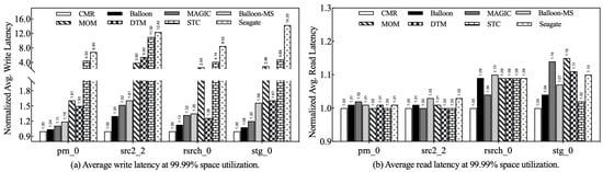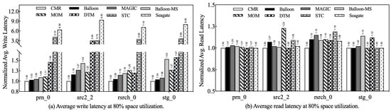 In addition, we also focused on the performance gap between Balloon-MS and other competitors without a persistent buffer. As shown in Figure 9a, Balloon-MS outperforms its competitors under both prn_0 and rsrch_0, achieving an average write performance improvement of 45.9% and 38.9%, respectively, while its write latency is higher than MOM under src2_2 and stg_0. This result is due to the fact that Balloon-MS makes full use of the available tracks to act as buffer tracks, and reclaiming buffer tracks introduces some overhead. At high utilization rates, as shown in Figure 10a, Balloon-MS consistently outperforms MOM. It is noteworthy that both MOM and Balloon-MS resume RMW operations when the disk reaches full capacity, because there are no free tracks available to store the migrated data or act as buffer tracks. However, unlike MOM, which simply moves interfered data to other top tracks to minimize data rewrites, Balloon-MS proactively uses buffer tracks to migrate hot data to the top tracks, effectively reducing the frequency of track rewrites. This key advantage is responsible for the superior write performance of Balloon-MS over MOM in various high-load scenarios.
