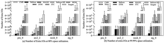 Extra I/O refers to track-level I/O caused by RMW operations or data shuffling apart from the user request. Therefore, the number of extra I/Os is a critical factor affecting write performance. Figure 11a,b shows the number of extra I/Os introduced by each strategy at medium and high utilization, respectively.