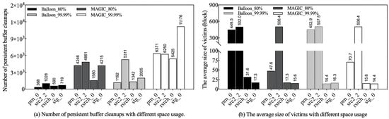 Of all the strategies evaluated, Balloon and MAGIC stand out by introducing a persistent buffer to reduce the frequency of track rewrites. However, frequent cleanups degrade disk performance [,]. To further investigate the factors contributing to the performance gap between Balloon and MAGIC, this section focuses on evaluating the cleanup efficiency of their persistent buffers under varying space utilization and workloads. Therefore, the number of cleanups and the average size of the victims are used as performance metrics, which are commonly used in similar studies [,,,].