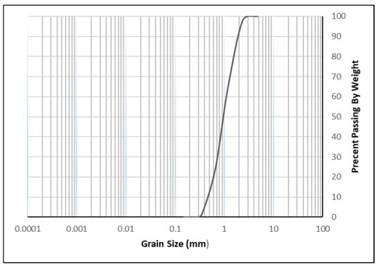 Sieve analysis was performed in accordance with ASTM D2487 [38] standards to determine the grain diameter distribution of the soil used in experimental studies. The grain diameter distribution curve of the sand soil used in the experimental study is given in Figure 1. According to the Unified Soil Classification System (USCS), the soil class is determined as poorly graded (uniform) sand (SP). The granulometry parameters of the sand used in the tests are given in Table 1.