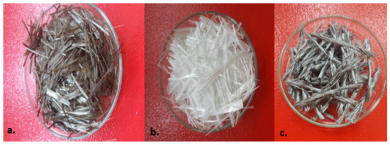 Basalt fibers, glass fiber, and macromesh fibers used in the tests are shown in Figure 2. The physical and mechanical properties of the fibers used in the study are given in Table 3.
