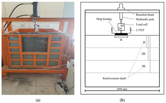 The model tank has a length of 1000 mm, a width of 300 mm, and a height of 1000 mm. The front is made of 20 mm thick glass fiber to display the displacement of the soil during loading, and the back and sides are made of sheet steel. Experimental studies were carried out under plane strain conditions using a strip foundation. For the model foundation, a rigid steel plate with a length of L = 300 mm, a height of H = 20 mm, and a width of B = 100 mm was used. The surfaces of the foundation in contact with the tank are covered with thick rubber material to reduce the friction coefficient. Based on the model, a hydraulic jack that can load up to 5000 kg according to the desired speed is used. To check the centric loading, two Linear Variable Differential Transformers (LVDT) were placed diagonally at the two corners of the footing plate and settlements were read. In the tests, an S-type load cell with a capacity of 5000 kg was used to determine the load values on the model base plate. During the tests, the settlements and stress values from the load cells and LVDTs were transferred to the data collection device and converted into numerical values. The schematic of the experimental setup is given in Figure 3.