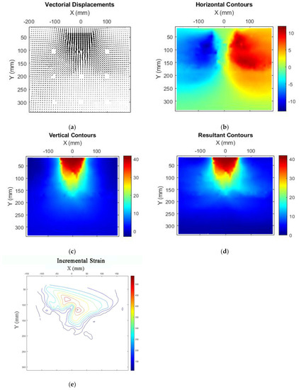 PIV results: (a) Vectorial displacements; (b) horizontal contours; (c) vertical contours; (d) resultant contours; (e) incremental strain.