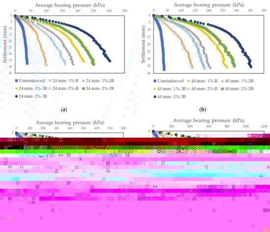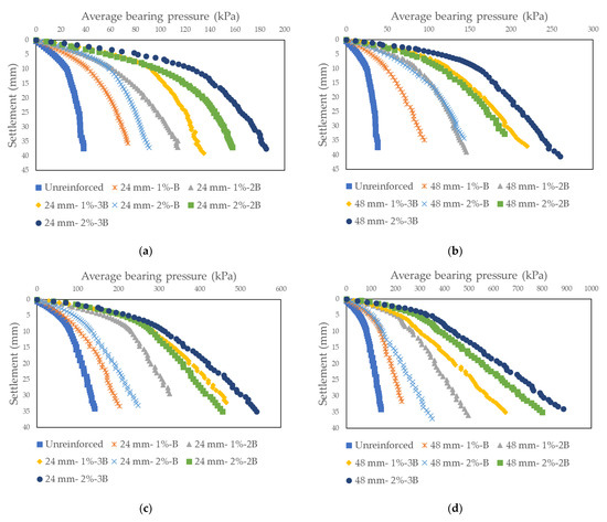 Average base pressure-settlement curves obtained as a result of model tests on sand soil randomly reinforced with glass + macromesh fiber: (a) Dr = 30%, Fl = 24 mm; (b) Dr = 30%, Fl = 48 mm; (c) Dr = 50%, Fl = 24 mm; (d) Dr = 50%, Fl = 48 mm.