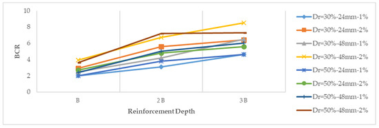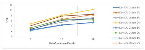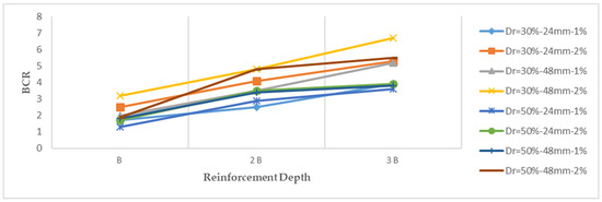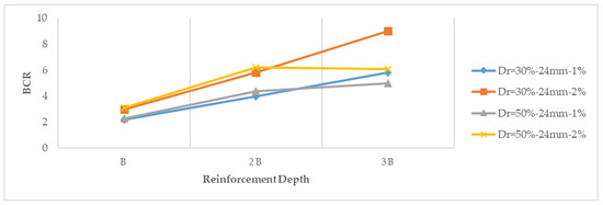 Variation of bearing capacity ratio (BCR) with reinforcement depth (Dr = 30–50%, Fl = 24–48 mm, Fc = 1–2%, and glass fiber).